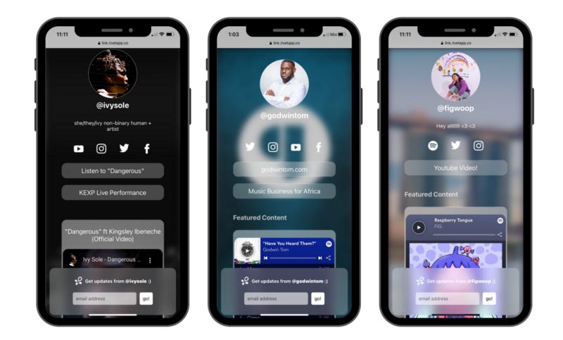 Made by artists, Rivet’s goal is to help creators develop, expand, and monetize their fanbase. By streamlining the fan funnel process, Rivet allows artists to quickly nurture and build lasting meaningful relationships with their superfans.